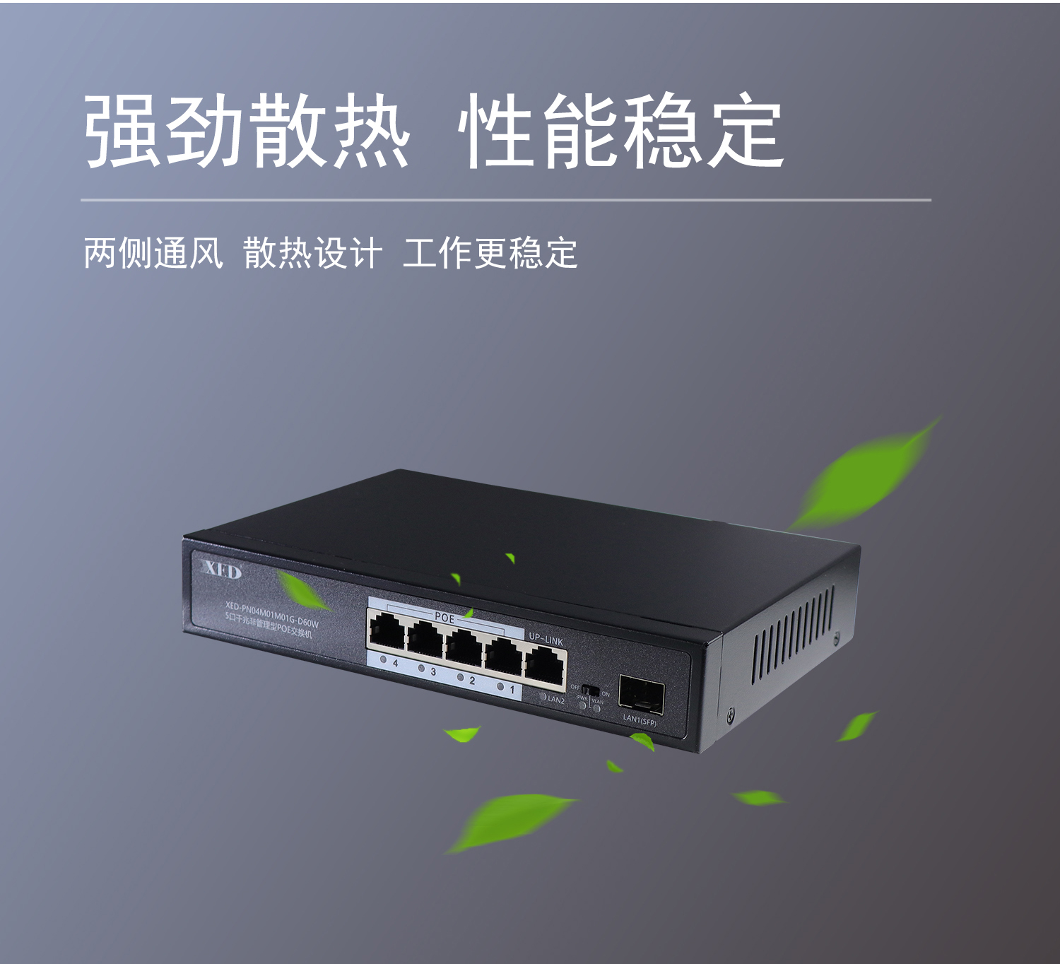XED-PN04M01M01G-D60W 4+1千兆POE交換機(jī),可通過網(wǎng)線為無線AP,攝像頭等PD設(shè)備提供最大單端口30W供電,支持一鍵開啟VLAN模式,完全滿足新一代組網(wǎng)需求,適用家庭,酒店,中小企業(yè)等各類場景;為您構(gòu)建更安全、更快速、可增值的可靠網(wǎng)絡(luò)。