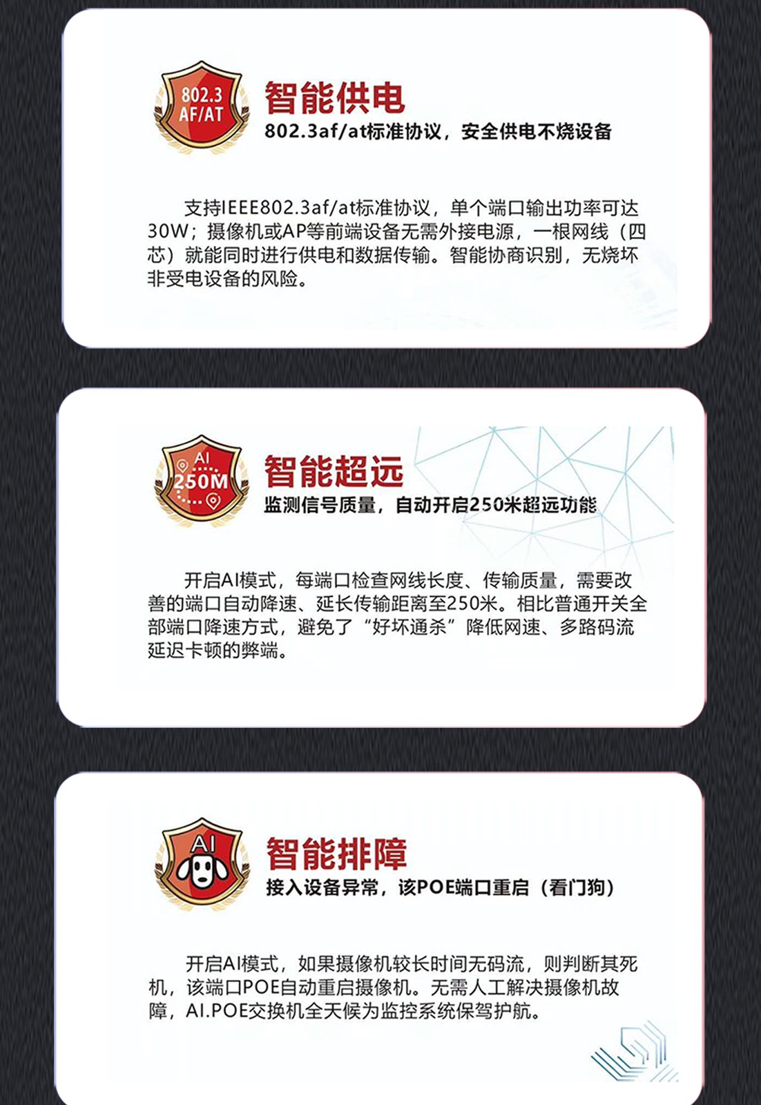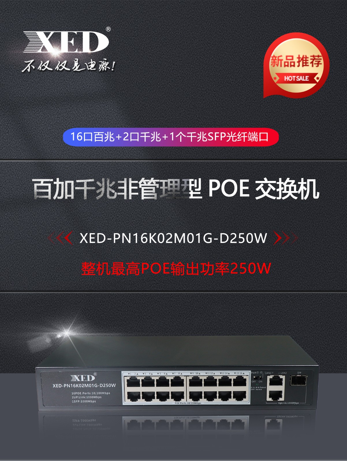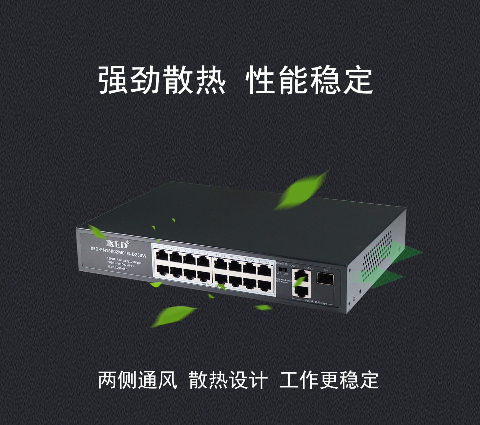 支持16口標(biāo)準(zhǔn)POE輸出,滿載功率250W;