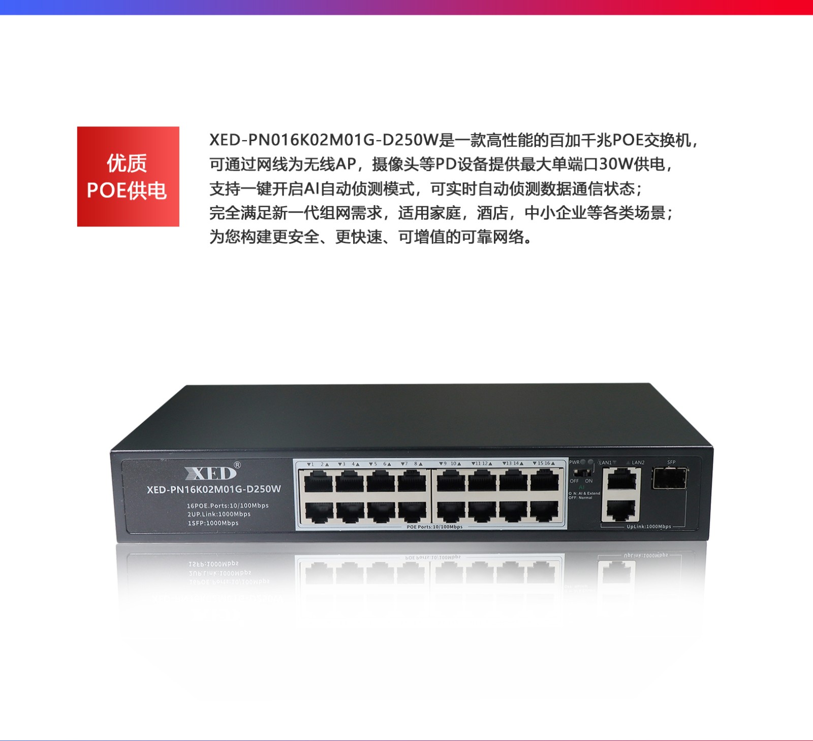 XED-PN016K02M01G-D250W是一款高性能的百加千兆POE交換機(jī),可通過網(wǎng)線為無線AP,攝像頭等PD設(shè)備提供最大單端口30W供電,支持一鍵開啟AI自動偵測模式,可實(shí)時自動偵測數(shù)據(jù)通信狀態(tài);完全滿足新一代組網(wǎng)需求,適用家庭,酒店,中小企業(yè)等各類場景;為您構(gòu)建更安全、更快速、可增值的可靠網(wǎng)絡(luò)。