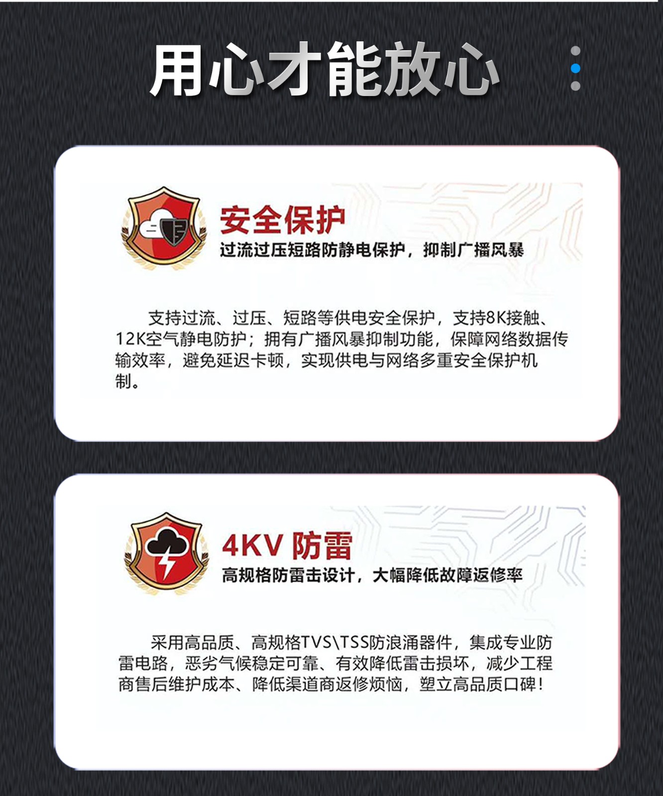 支持AI智能檢測模式當(dāng),端口通信故障時,對應(yīng)端口PoE將自動重啟,自行修復(fù)網(wǎng)絡(luò)通信,免除人工維護(hù)麻煩,同時端口相互隔離,抑制網(wǎng)絡(luò)風(fēng)暴;
