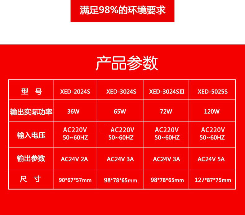 XED-3024S低壓AC/AC電源,AC24V低壓輸出電壓,變壓器電源適配器。 產品應用領域: 可適用范圍一般用于小型設備,或者安全特低電源等級產品。 產品特點: 采用純銅,優質鋼片繞線制成,功率充足,溫度低,抗沖擊性能好。 自身的干擾和噪聲都比較小,可以達到很高的穩定度,波紋較小。
