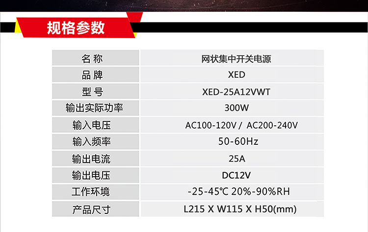 XED-25A12VWT網狀集中開關電源,寬電壓AC100-240V輸入。