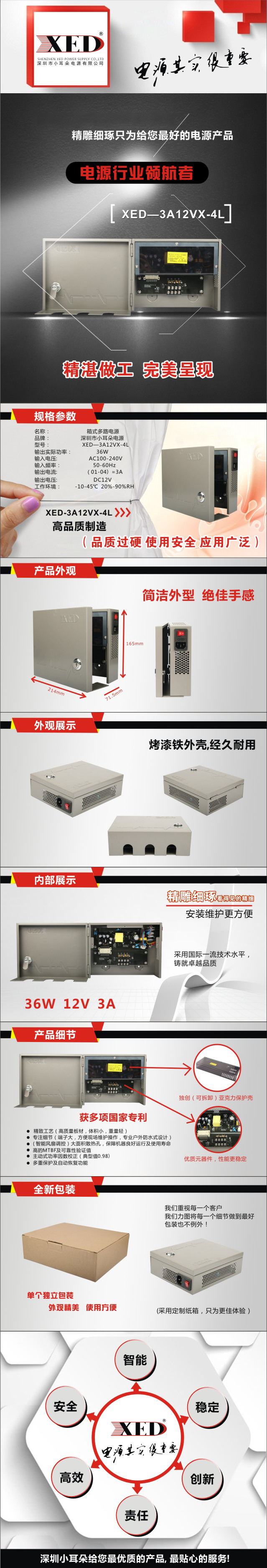 XED-3A12VX-4L箱式多路開關電源,寬電壓AC100-240V輸入,4路箱式開關電源,適用室內外多路接線使用。 產品特點: 采用壁掛式烤漆外殼,電路設計穩定可靠; 集中大功率多路輸出方式,獨立單路短路保護裝置; 主動式功率因數校正(典型值0.98); 具有過熱保護、過流保護、過壓保護、自動恢復功能; 外觀精美,安全性能高。